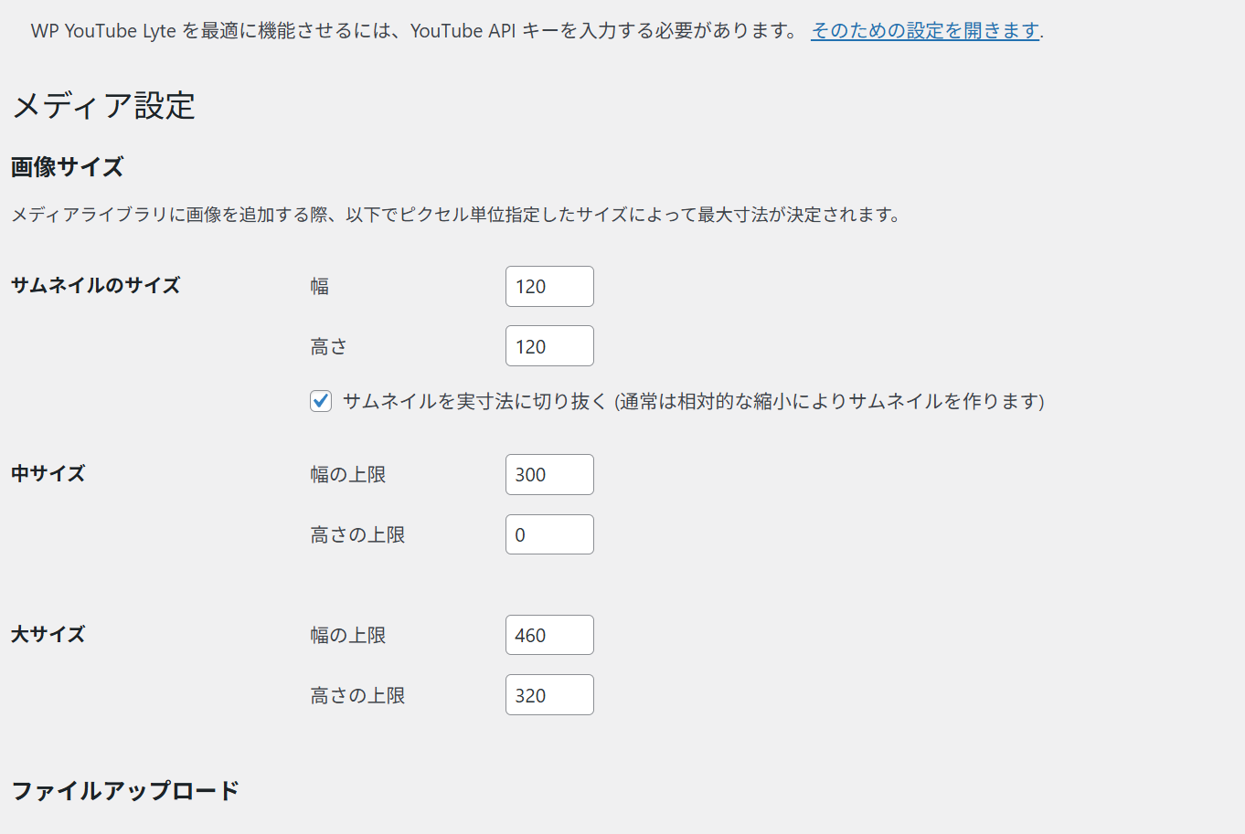 【設定】→【メディア】にて、基本的な画像サイズを指定できます。