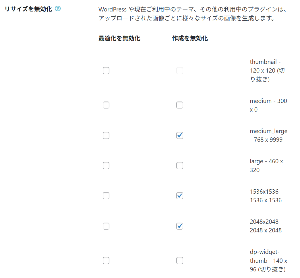 それらを調整したい場合は、【EWWW Image Optimizer】プラグインを入れることでサイズ調整、また不要なサイズの画像を書き出さないように設定できます。