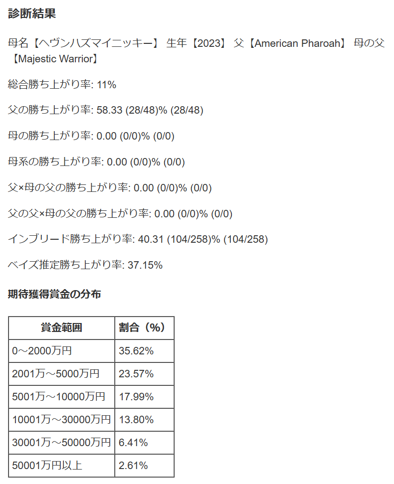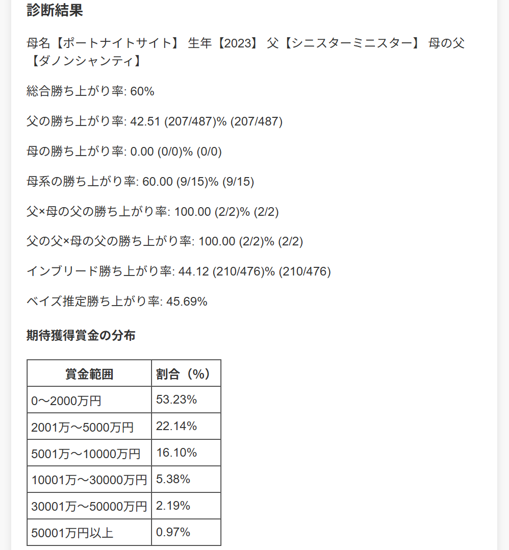 この馬の血統診断は先述の通り、この2頭ほどではないにしても、応募してもいいくらいの数字だ。